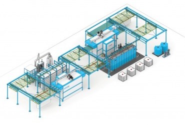 Агрегат по химической подготовке изготовлен из нержавеющей стали и состоит из трех зон: обезжиривание и две зоны промывки. Обработка осуществляется струйным способом по разработанной технологии, при этом растворы и промывочные воды рециркулируются. Подогрев ванн с химическими растворами ведется до 55°C с помощью газовой горелки. Для автоматического поддержания рабочих параметров используется система контроля и дозировки химикатов, а также оборудование для очистки ванн от масла и шлама. В целях предотвращения выхода паров раствора в цех применяется вытяжная система с каплеуловителями.